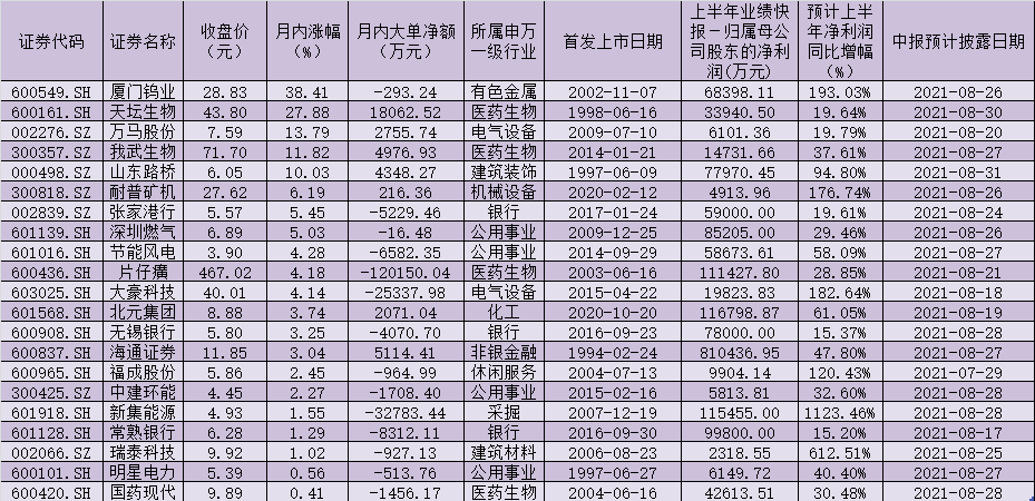 表:21家月內(nèi)股價(jià)實(shí)現(xiàn)上漲的已披露半年度業(yè)績(jī)快報(bào)的公司一覽