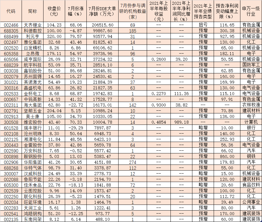 近期,市場(chǎng)做多資金也紛紛涌入部分中報(bào)業(yè)績(jī)超預(yù)期的機(jī)構(gòu)調(diào)研品種進(jìn)行搶籌。統(tǒng)計(jì)顯示,上述178只上半年凈利潤(rùn)實(shí)現(xiàn)或有望實(shí)現(xiàn)同比增長(zhǎng)的個(gè)股中,7月份共有35只個(gè)股呈現(xiàn)大單資金凈流入態(tài)勢(shì),合計(jì)吸金89.84億元。天齊鋰業(yè)最受追捧,期間累計(jì)大單資金凈流入達(dá)20.65億元,包括科德數(shù)控、利元亨、雅化集團(tuán)、日發(fā)精機(jī)、立昂微、咸亨國(guó)際等在內(nèi)的17只個(gè)股期間均受到1億元以上大單資金搶籌。