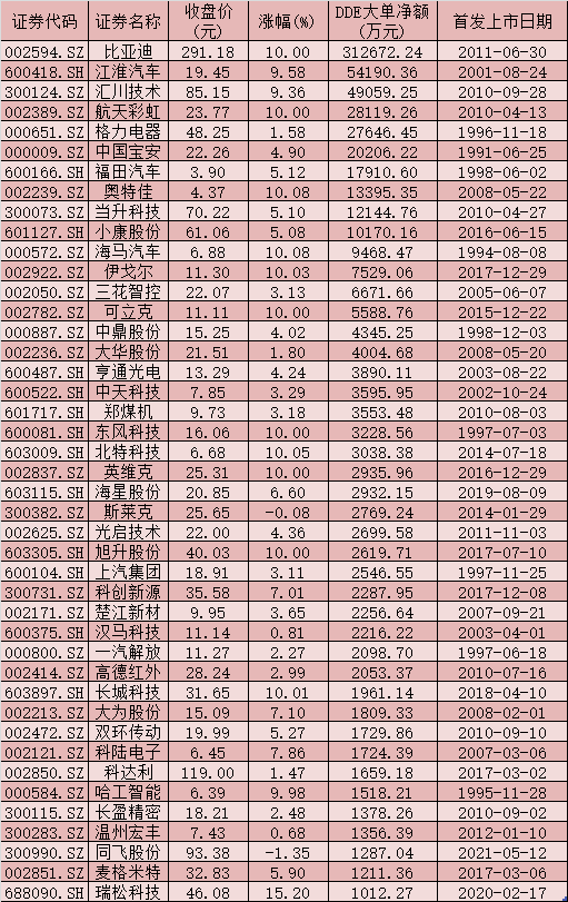 表:8月2日大單資金凈流入在1000萬(wàn)元以上的新能源車(chē)概念股一覽
