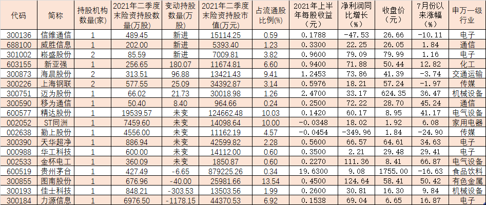 具體到個股方面,截至今年二季度末,險資新進持有信維通信、威勝信息、崧盛股份等3只個股,持股數(shù)量分別為489.45萬股、202.00萬股、85.59萬股,持股市值分別為15114.25萬元、5393.40萬元、7009.81萬元。同時,今年二季度險資繼續(xù)對新亞強、海晨股份、上海鋼聯(lián)、邁為股份、移為通信等5只個股進行加倉操作,增持數(shù)量分別達到180.07萬股、96.88萬股、25.09萬股、21.73萬股、8.40萬股。