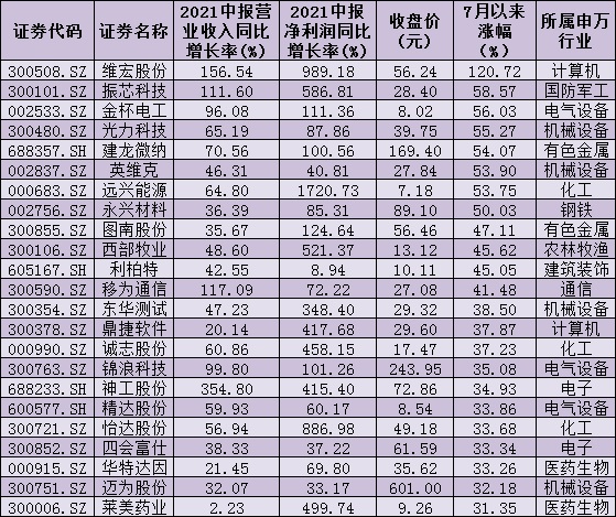 表:7月份以來(lái)累計(jì)漲幅超30%的中報(bào)業(yè)績(jī)雙增長(zhǎng)公司情況: