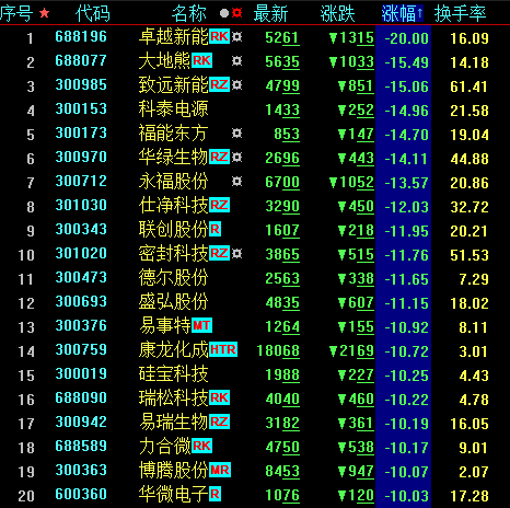 圖為滬深兩市跌幅榜前20只個(gè)股