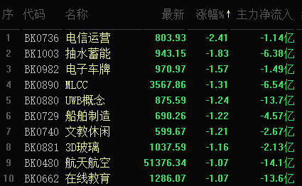 此外,電信運(yùn)營、抽水蓄能、電子車牌等10類板塊跌幅均超1%。