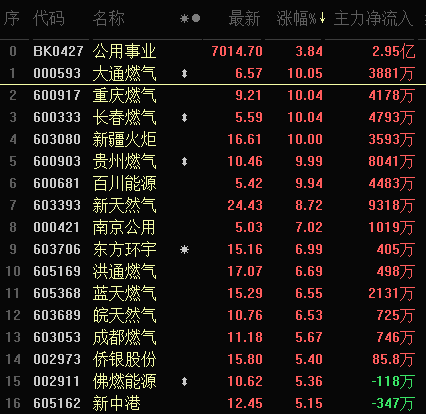 排名第二位的是公用事業(yè),板塊上漲3.84%,大單資金凈流入達(dá)6.44億元,大通燃?xì)?、重慶燃?xì)?、長春燃?xì)獾?只個股漲停。