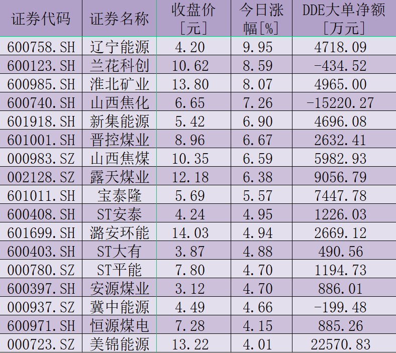 受焦煤焦炭價(jià)格上漲影響,今日A股煤炭開采加工板塊大幅上漲。截至15:00,該板塊漲幅達(dá)到4.25%,大幅跑贏上證指數(shù)(漲幅0.74%)。具體到個(gè)股方面,共有遼寧能源、ST安泰和ST大有等在內(nèi)的3只個(gè)股漲停;此外,包括蘭花科創(chuàng)(8.59%)、淮北礦業(yè)(8.07%)、山西焦化(7.26%)、新集能源(6.90%)、晉控煤業(yè)(6.67%)等在內(nèi)的8只個(gè)股漲幅也超過5%。