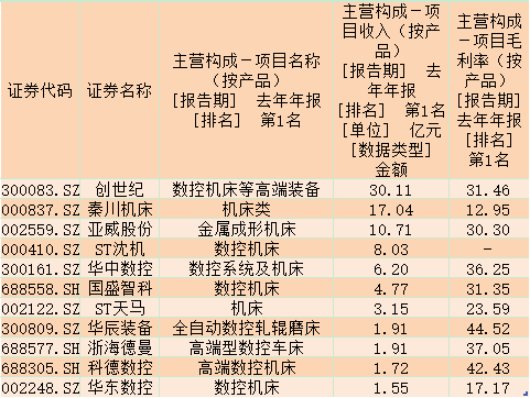 通過表格可以發(fā)現(xiàn),去年主營構(gòu)成第一位是機(jī)床類項(xiàng)目的12家公司,項(xiàng)目收入均超1.55億元,其中,創(chuàng)世紀(jì)數(shù)控機(jī)床等高端裝備收入30.11億元,毛利率31.46%。此外,秦川機(jī)床和亞威股份的這一項(xiàng)目收入也超過10億元。
