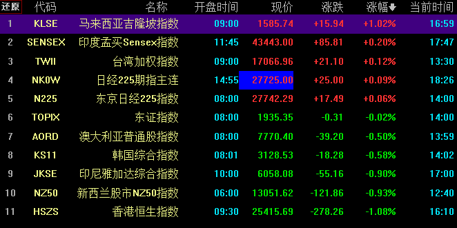 今日,亞太市場主要股指漲跌情況如下表。