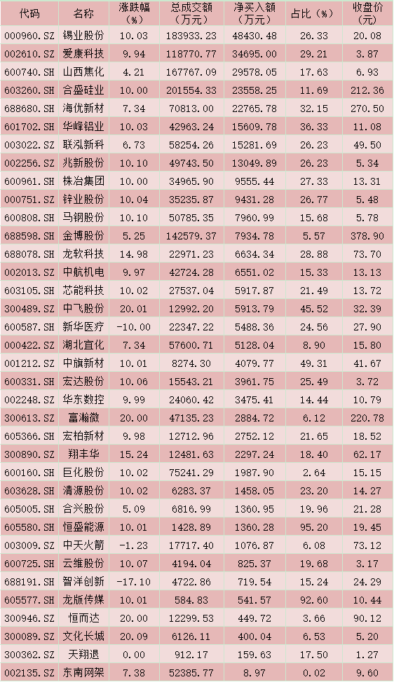 有36只個(gè)股受到前十大營業(yè)部搶籌,其中,錫業(yè)股份(48430.48萬元)、愛康科技(34695.00萬元)、山西焦化(29578.05萬元)、合盛硅業(yè)(23558.25萬元)、海優(yōu)新材(22765.78萬元)等5只個(gè)股凈買入額過2億元。