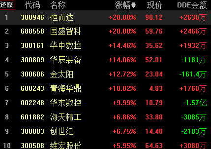 從熱點(diǎn)板塊來看,漲幅榜前10位的板塊近5日漲幅有5個(gè)超過10%,顯示A股部分板塊持續(xù)性較好。工業(yè)母機(jī)再次登上同花順指數(shù)漲幅榜首,不過,板塊DDE資金卻出現(xiàn)1.04億元的凈流出,有包括國盛智科、恒而達(dá)在內(nèi)的5只個(gè)股漲停。