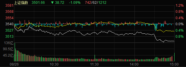 8月26日,A股三大指數(shù)持續(xù)走弱,集體跌超1%,截至收盤,上證指數(shù)跌1.09%,深證成指跌1.92%,創(chuàng)業(yè)板指跌2.51%;滬深兩市合計(jì)成交額13743.07億元,兩市成交額連續(xù)第27個(gè)交易日突破1萬億元;北向資金凈買入12.29億元。