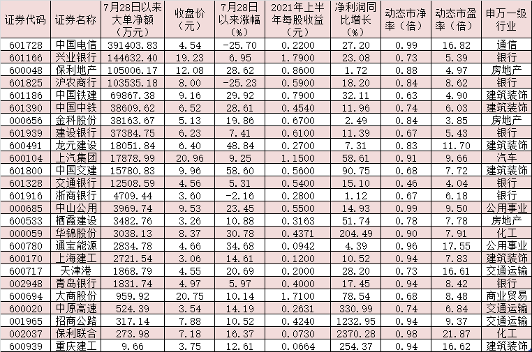 表:7月28日以來獲大單資金追捧的破凈股一覽