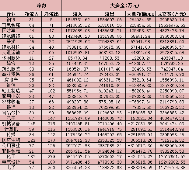 資金流向方面,周四,滬深兩市大單資金凈流出380.97億元,從申萬一級(jí)行業(yè)來看,僅7個(gè)行業(yè)呈現(xiàn)資金流入態(tài)勢(shì),鋼鐵和有色金屬等兩行業(yè)大單資金凈流入均在20億元以上。