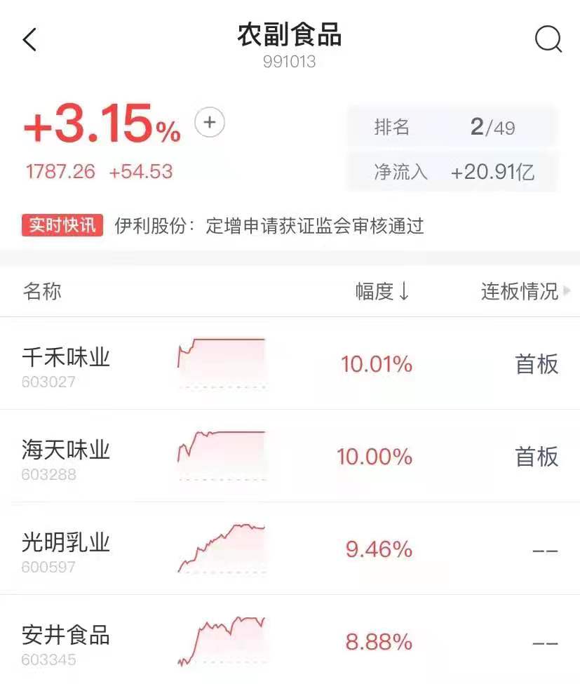 具體來(lái)看,周五,在經(jīng)歷了股價(jià)持續(xù)低迷的食品飲料概念股出現(xiàn)大漲,板塊漲幅達(dá)3.54%。其中,海天味業(yè)、千禾味業(yè)等兩大醬油股罕見聯(lián)袂漲停,此外,乳業(yè)、白酒概念亦表現(xiàn)強(qiáng)勢(shì),妙可藍(lán)多、迎駕貢酒、金種子酒等大漲,貴州茅臺(tái)、五糧液漲近4%。股民紛紛表示:這是王者回歸啊,茅概念的春天回來(lái)了!