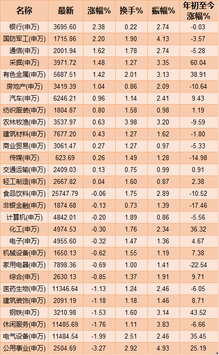 具體板塊方面,銀行和國防軍工表現(xiàn)強勢;公用事業(yè)、電氣設(shè)備和休閑服務(wù)走低。