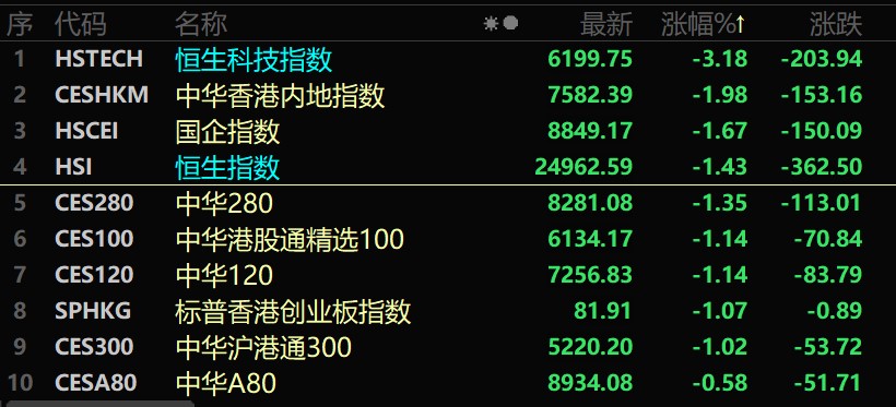 經(jīng)過近期的震蕩反彈,10月12日,港股市場出現(xiàn)集體回調(diào),截至收盤,港股市場主要指數(shù)普遍收跌,其中,恒生指數(shù)跌1.43%,報24962.59點,恒生科技指數(shù)跌3.18%,報6199.75點。