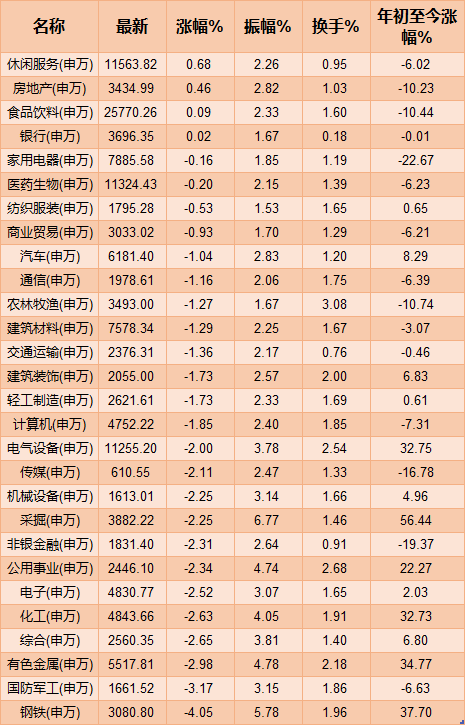具體來看,行業(yè)板塊僅有休閑服務、房地產(chǎn)、食品飲料和銀行等4類飄紅,鋼鐵與有色金屬等周期股領(lǐng)跌。