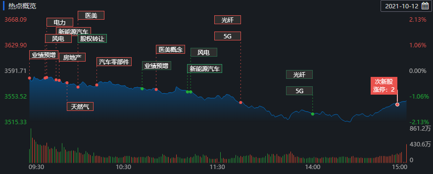 10月12日,A股市場深幅調(diào)整,三大指數(shù)集體跌超1%,截至收盤,上證指數(shù)跌1.25%,深證成指跌1.62%,創(chuàng)業(yè)板指跌1.81%;滬深兩市合計成交額9965.90億元;北向資金凈賣出13.79億元;總體來看,兩市個股普跌,超3600只個股下跌。