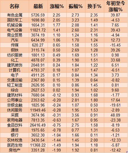 從申萬一級行業(yè)板塊來看,有16類行業(yè)上漲,其中有色金屬、國防軍工等2類行業(yè)漲幅均超2%,房地產(chǎn)、醫(yī)藥生物、農(nóng)林牧漁、銀行等跌幅均超1%。