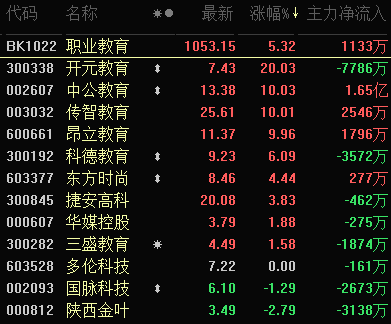 職業(yè)教育上漲5.32%居概念板塊漲幅第二位,12只交易中的個股有9只上漲,其中,開元教育、中公教育、傳智教育和昂立教育等4個股漲停報收。