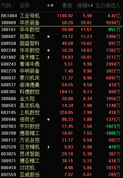 概念板塊方面,工業(yè)母機漲幅居前,漲幅達5.98%,40只交易中的個股有36只上漲,占比九成,其中,華辰裝備、華東數(shù)控、海天精工、青海華鼎、華明裝備、秦川機床等6只個股漲停報收。