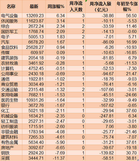 從申萬(wàn)一級(jí)行業(yè)來(lái)看,本周逾8類申萬(wàn)一級(jí)行業(yè)實(shí)現(xiàn)上漲,其中,電氣設(shè)備(6.34%)、休閑服務(wù)(3.14%)、綜合(2.34%)、國(guó)防軍工(2.09%)等4類行業(yè)指數(shù)周漲幅均超2%。此外,采掘(-11.37%)、鋼鐵(-7.69%)、房地產(chǎn)(-6.65%)、有色金屬(-5.90%)等4類行業(yè)指數(shù)周跌幅均超5%。