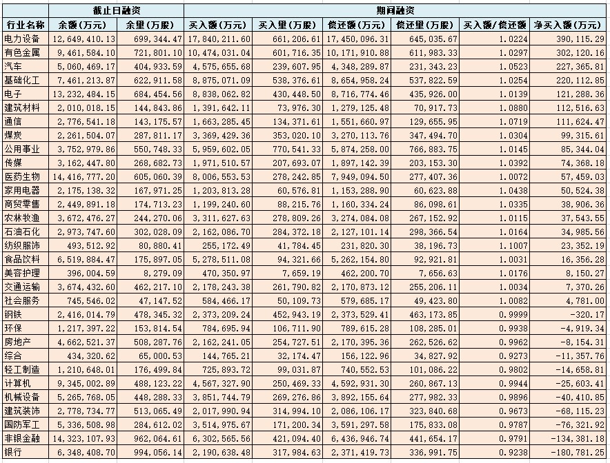 融資客在10月份加倉超百億元的同時,其在行業(yè)投資布局方面卻表現(xiàn)出了明顯的差異性。從申萬一級行業(yè)來看,31個行業(yè)中有20個行業(yè)在10月份獲得融資客加倉,電力設(shè)備、有色金屬、汽車、基礎(chǔ)化工等四大行業(yè)受到特別青睞,期間累計凈買入額分別為39.01億元、30.21億元、22.74億元、22.01億元。而大金融板塊則遭到大額賣出,銀行和非銀金融遭到融資客凈賣出額居前,分別為18.08億元、13.44億元。