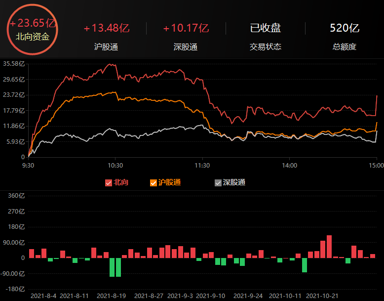 11月2日,北向資金凈買入23.65億元,其中,滬股通凈買入額達13.48億元,深股通凈買入額達10.17億元。