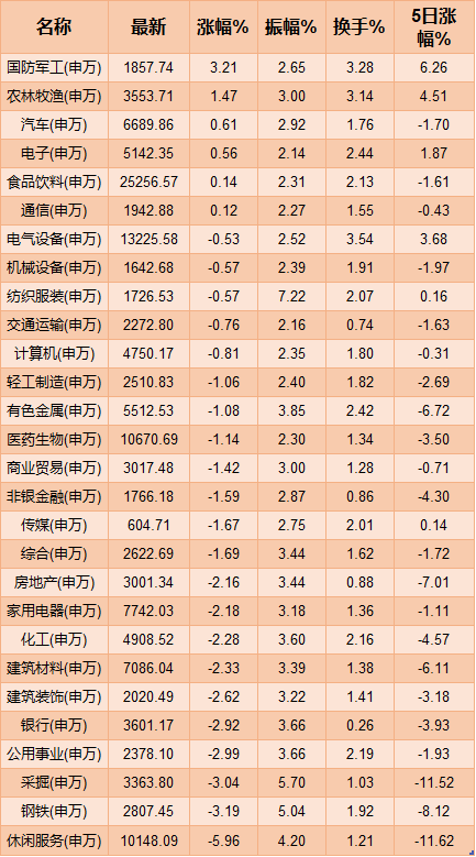 從申申萬行業(yè)指數(shù)方面來看,僅國防軍工、農(nóng)林牧漁、汽車、電子、食品飲料、通信等6個行業(yè)指數(shù)實現(xiàn)上漲,其余行業(yè)指數(shù)均有不同程度的下跌,采掘、鋼鐵、休閑服務等3個行業(yè)指數(shù)跌幅居前,均跌超3%。