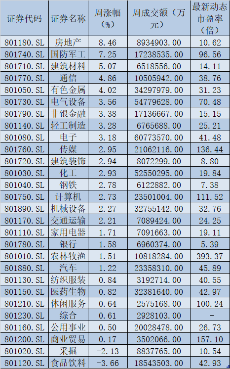從申萬一級(jí)行業(yè)來看,本周有26個(gè)行業(yè)實(shí)現(xiàn)上漲,其中,房地產(chǎn)、國(guó)防軍工、建筑材料等行業(yè)指數(shù)周漲幅均超5%。另外,食品飲料和采掘等行業(yè)指數(shù)周跌幅則均超2%。