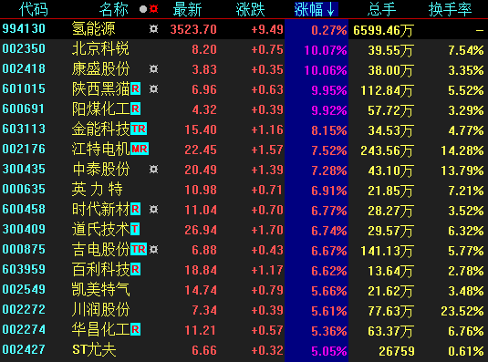 11月18日,氫能源概念股大面積飄紅,包括北京科銳、康盛股份、陜西黑貓等在內(nèi)的5只概念股集體漲停,金能科技、中泰股份、英力特等個股也紛紛跟漲。