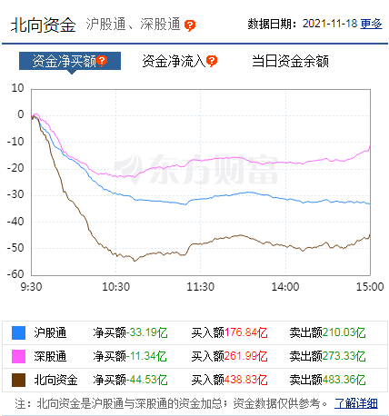 北向資金延續(xù)凈流出態(tài)勢,11月18日,北向資金凈賣出44.53億元,其中,滬股通凈賣出33.19億元,深股通凈買入11.34億元。