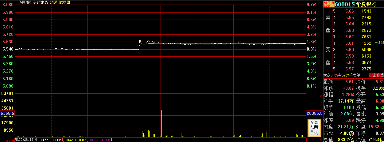 今日盤中,華夏銀行出現(xiàn)異動,在持續(xù)心電圖走勢時,于11點12分一筆5萬手的大單橫掃上方買單,讓華夏銀行股價沖至漲停價附近的6.08元,一分鐘不到隨即回落震蕩。