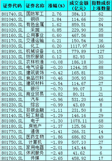 從申萬一級行業(yè)來看,有9個行業(yè)實現(xiàn)上漲,其中,國防軍工行業(yè)領(lǐng)漲,漲幅達到2.76%,鋼鐵和有色金屬等行業(yè)漲幅也均在1%以上,漲幅分別為1.84%、1.62%;另外,傳媒、休閑服務(wù)、家用電器等行業(yè)則震蕩走低,跌幅均超2%。