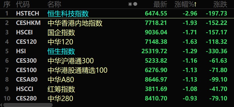 經(jīng)過近期的震蕩反彈后,11月18日,港股市場再度面臨大幅調(diào)整,恒生科技指數(shù)盤中一度跌超3%,截至收盤,港股主要指數(shù)普遍下跌,恒生科技指數(shù)跌2.96%,報6474.55點;恒生指數(shù)跌1.29%,報25319.72點。