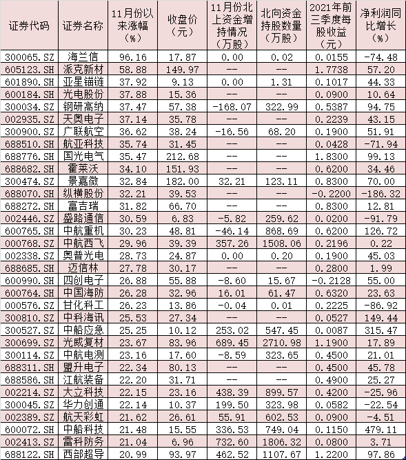 近期北向資金也開始涌入部分軍工股進(jìn)行加倉。統(tǒng)計(jì)顯示,截至11月30日,81只軍工股獲北向資金持倉,合計(jì)持股數(shù)量為7.26億股,較10月末增長5.38%。其中,46只個(gè)股11月份以來受到北向資金青睞,雷科防務(wù)、光威復(fù)材、中兵紅箭等3只個(gè)股期間北向資金增持?jǐn)?shù)量均超500萬股。