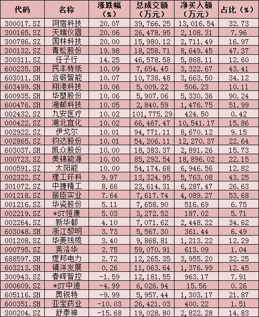 值得關(guān)注的是,網(wǎng)宿科技、天瑞儀器、國(guó)林科技等3只個(gè)股,周三均報(bào)收于“20厘米”漲停,勇登龍虎榜。