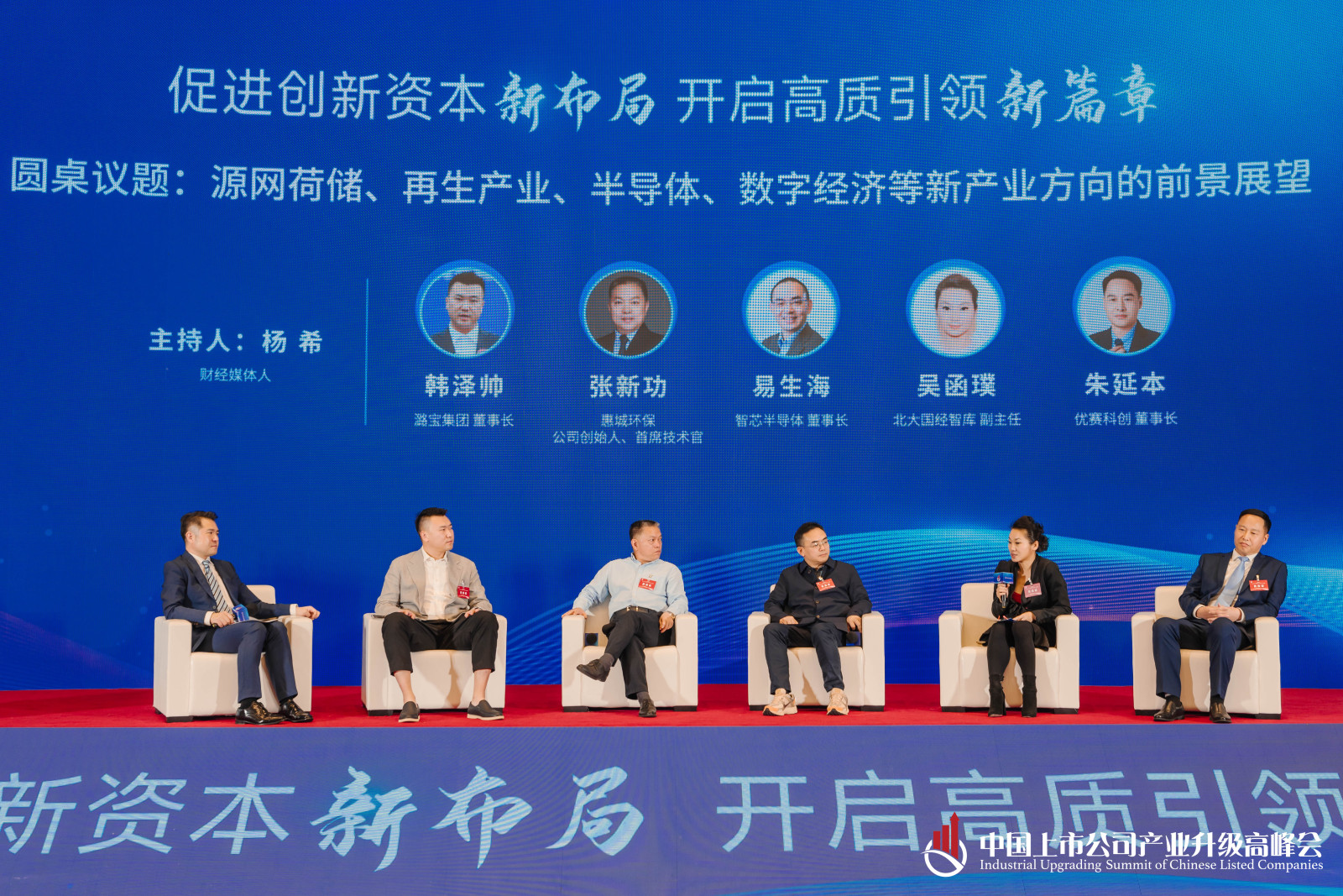本場論壇的主題是新質(zhì)生產(chǎn)力發(fā)展論壇,探討一下源網(wǎng)荷儲、再生產(chǎn)業(yè)、半導(dǎo)體、數(shù)字經(jīng)濟(jì)等新產(chǎn)業(yè)的方向。首先有請參與本場論壇的各位對話嘉賓,他們分別是:潞寶集團(tuán)董事長韓澤帥;惠城環(huán)保董事長張新功;智芯半導(dǎo)體董事長易生海;國經(jīng)智庫副主任吳函璞;優(yōu)賽科創(chuàng)董事長朱延本。
