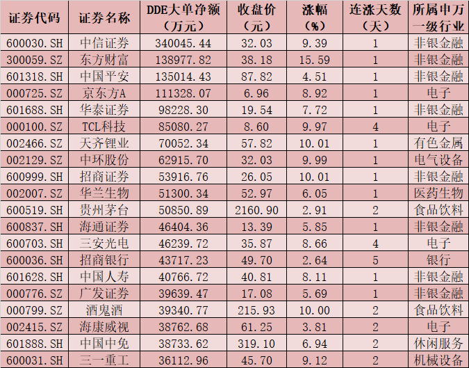 周二券商板塊有42只個股累計呈DDE大單主動凈流入態(tài)勢,其中,中信證券(34.00億元)、東方財富(13.90億元)、華泰證券(9.82億元)、招商證券(5.39億元)、海通證券(4.64億元)、廣發(fā)證券(3.96億元)、國泰君安(2.75億元)、興業(yè)證券(2.55億元)、中金公司(2.47億元)等9只個股DDE大單凈買入額均超2億元,合計79.49億元...>>詳情