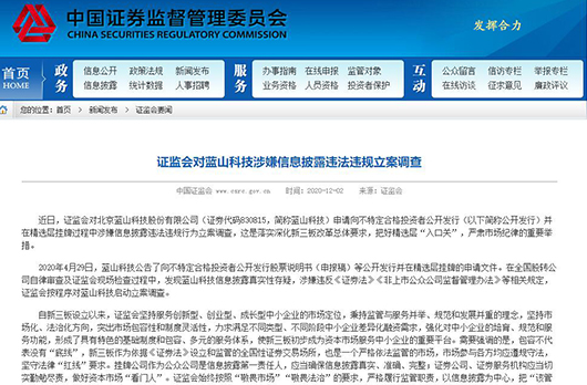 12月2日,證監(jiān)會表示,對北京藍山科技股份有限公司(以下簡稱藍山科技)申請向不特定合格投資者公開發(fā)行并在精選層掛牌過程中涉嫌信息披露違法違規(guī)行為立案調(diào)查。...>>詳情