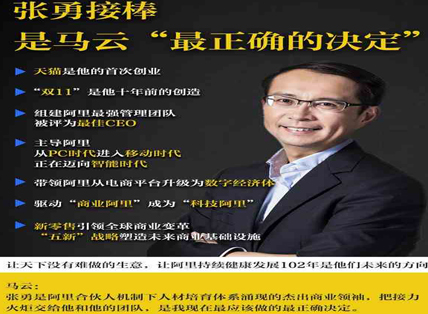 馬云在公開(kāi)信中高度評(píng)價(jià)張勇:在擔(dān)任CEO的3年多中,張勇以卓越的商業(yè)才華、堅(jiān)定沉著的領(lǐng)導(dǎo)力、超級(jí)計(jì)算機(jī)一般的邏輯和......[詳細(xì)]