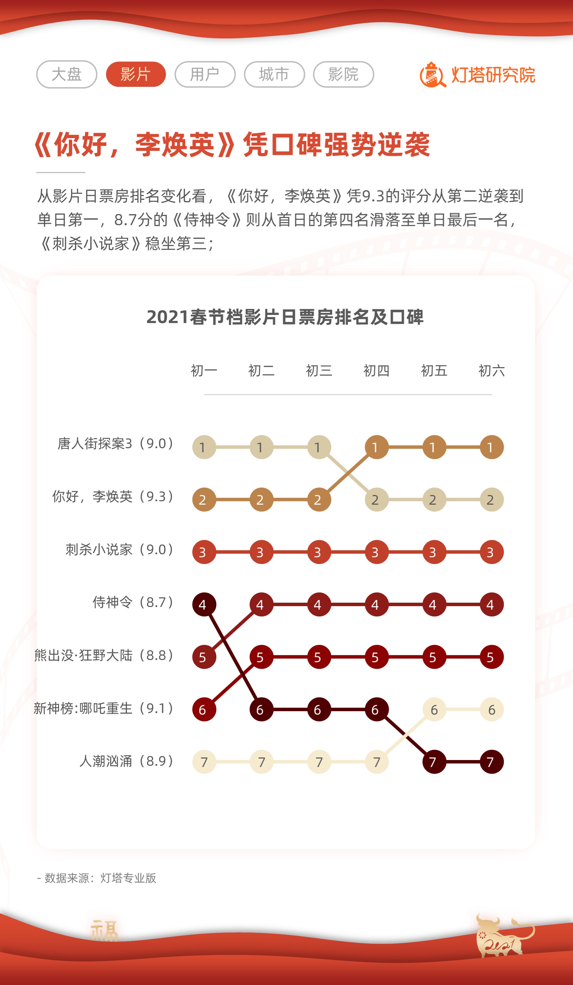 報告顯示,本屆春節(jié)檔七部影片呈現(xiàn)出不同的市場走勢。從影片日票房排名變化來看,《你好,李煥英》憑借超強的口碑于大年初四逆襲至單日票房第一;《侍神令》則從首日的第四名滑落至最后一名。此外,在《唐人街探案3》《你好,李煥英》之后,備受期待的奇幻題材電影《刺殺小說家》的票房成績及口碑均穩(wěn)定保持在第三名。