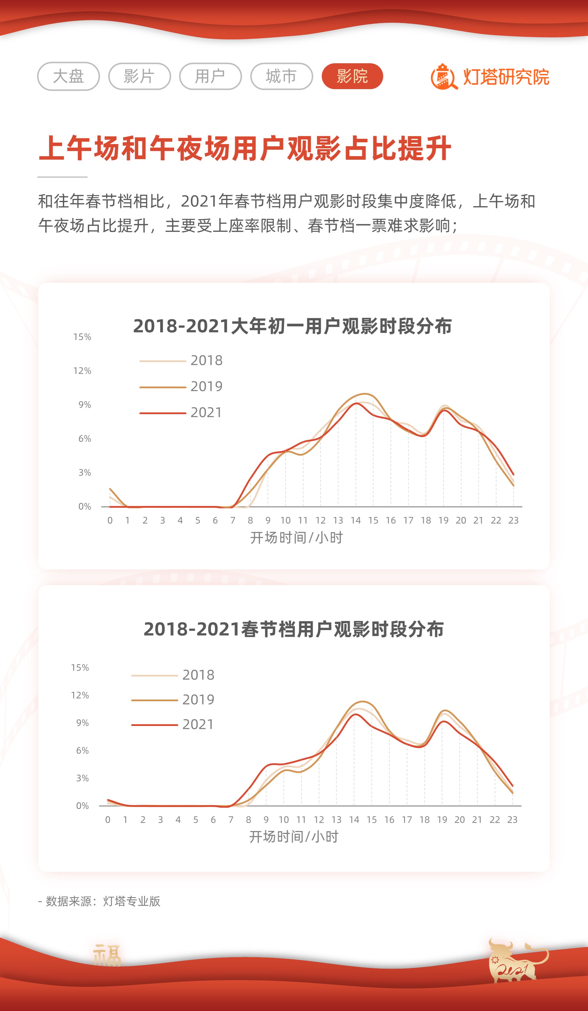 從用戶數(shù)據(jù)來看,本屆春節(jié)檔,80%的用戶僅觀看1部影片;雙人結伴觀影占比較2019年春節(jié)檔降低7%,單人和多人觀影側則均有提升。因影院上座率依舊有所限制、春節(jié)檔影片一票難求,用戶觀影時段集中度較往期春節(jié)檔有明顯降低,14:00-15:00場次依舊是最受歡迎的觀影時段,與此同時,上午場和夜場觀影占比有所提升。