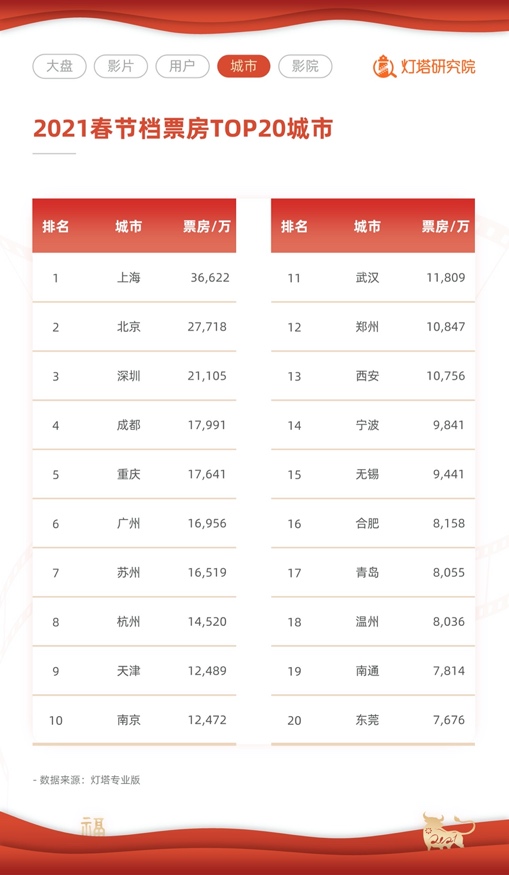 阿里影業(yè)旗下燈塔研究院《2021春節(jié)檔市場數(shù)據(jù)洞察報告》顯示,除78.22億元總票房成績較2019年大增32.5%創(chuàng)下新紀錄外,2021春節(jié)檔同時憑借1.6億總觀影人次再創(chuàng)新紀錄;票房排名前兩位的影片《唐人街探案3》(35.5億元)、《你好,李煥英》(27.2億元),將八成票房攬入囊中。