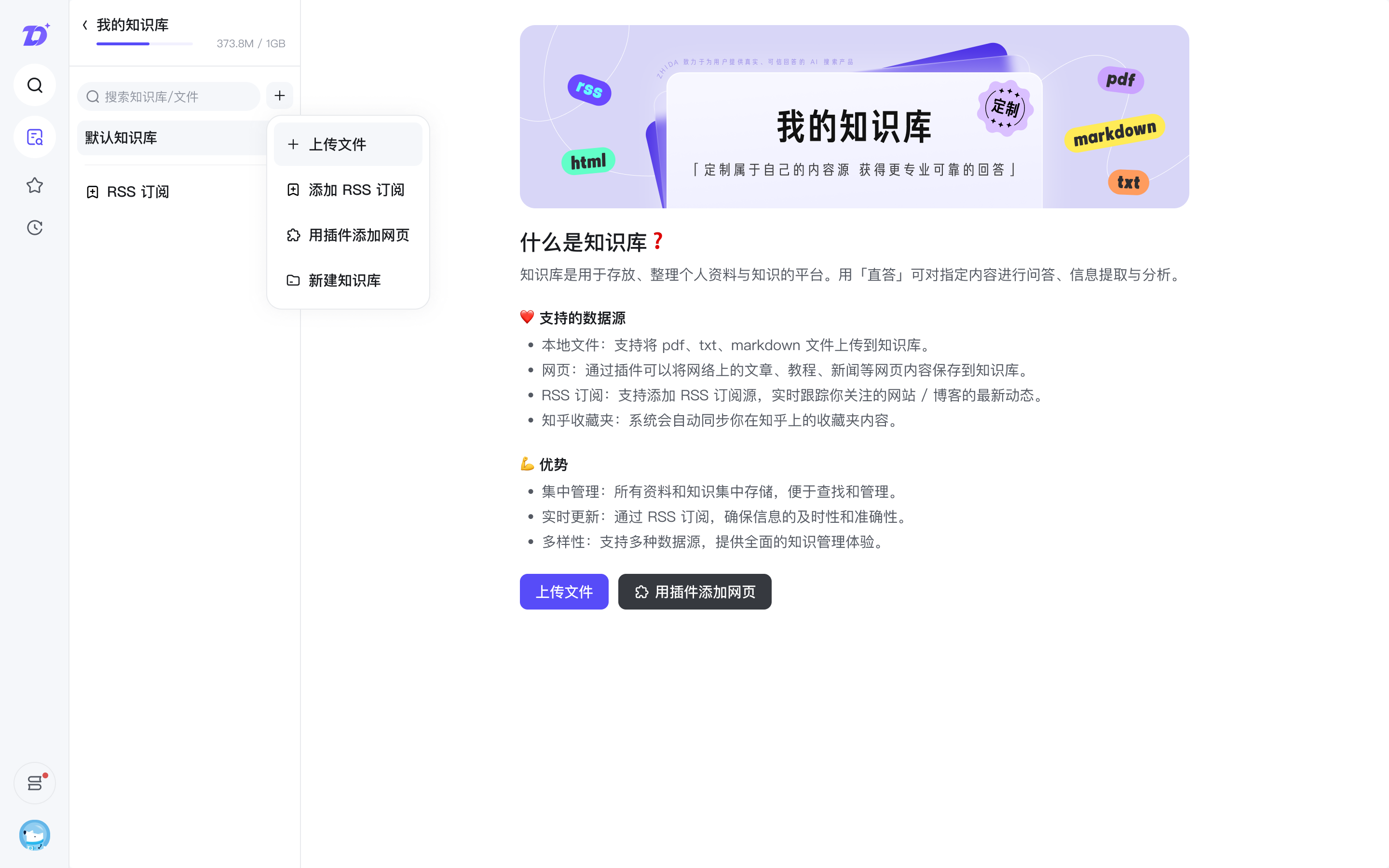 此外,知乎直答還同步上線知識(shí)庫(kù)功能,集合了本地文件上傳、網(wǎng)頁(yè)收藏、RSS訂閱、知乎收藏夾等模塊,用戶可使用DeepSeek-R1模型對(duì)論文、文檔、網(wǎng)頁(yè)、知乎問(wèn)答等特有內(nèi)容進(jìn)行信息提取、分析和分享,便于構(gòu)建和管理屬于用戶的個(gè)人知識(shí)庫(kù)。
