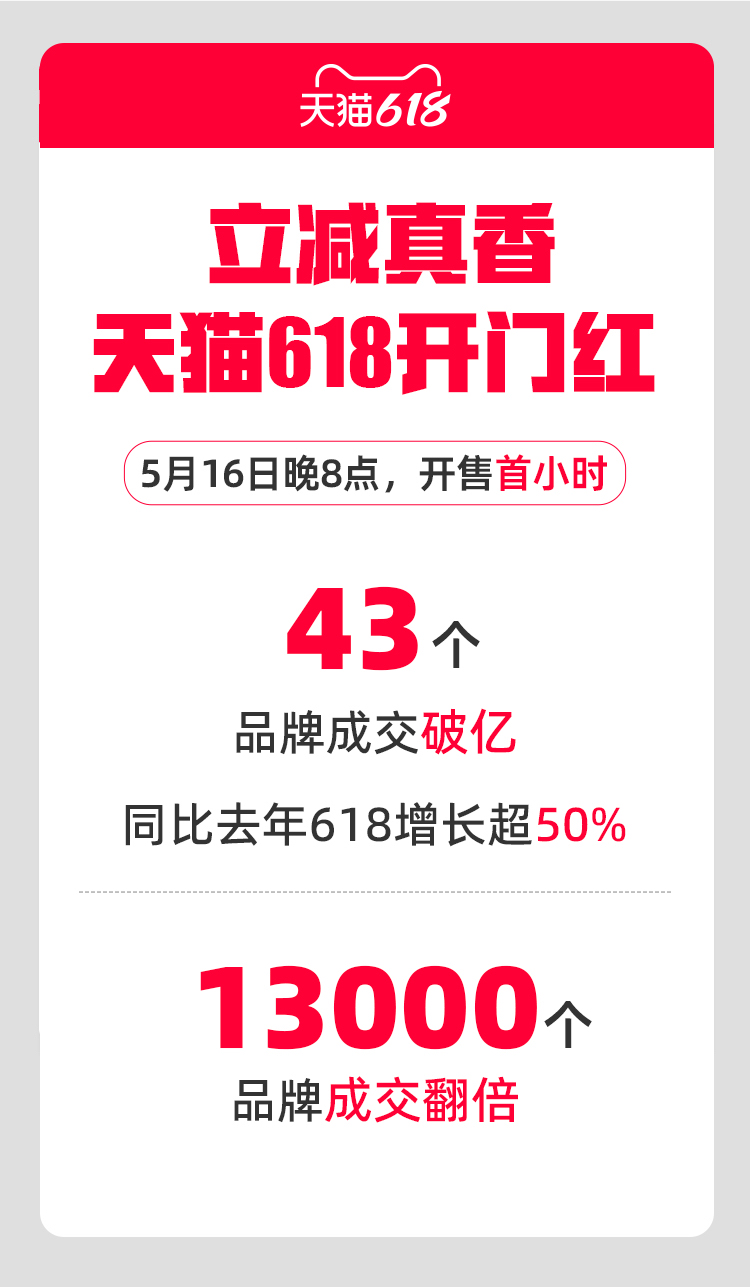 本報(bào)訊 (記者袁傳璽)5月16日晚8點(diǎn),主打“最便宜、最簡(jiǎn)單”的天貓618火爆開(kāi)售。開(kāi)賣首小時(shí),超13000個(gè)品牌成交翻倍,蘋果、美的、海爾、小米、源氏木語(yǔ)、華為、珀萊雅、耐克、格力、歐萊雅、斐樂(lè)、小天鵝等43個(gè)品牌快速破億元,“億元俱樂(lè)部”品牌數(shù)量較去年618同期增長(zhǎng)超50%。3C數(shù)碼、美妝、家電家裝、服飾、運(yùn)動(dòng)戶外、寵物、國(guó)際等各大行業(yè)成交全面超預(yù)期。