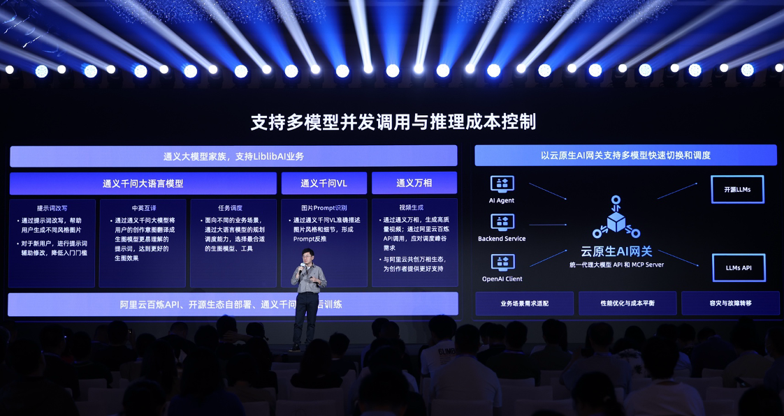 在社區(qū)層面,LiblibAI通過接入通義系列模型實(shí)現(xiàn)多模型并發(fā)調(diào)用與推理成本控制。在提示詞環(huán)節(jié),針對(duì)圖像風(fēng)格和中英語言問題,通義千問可對(duì)用戶提示詞進(jìn)行改寫,并翻譯成圖像模型能夠理解的描述。此外,用戶還可提供參考圖片,通過通義千問VL進(jìn)行識(shí)別,更準(zhǔn)確地描述想要生成的圖片風(fēng)格和細(xì)節(jié)。在模型選擇上,通義千問可根據(jù)用戶需求對(duì)模型進(jìn)行規(guī)劃調(diào)度,同時(shí)阿里云云原生AI網(wǎng)關(guān)支持多模型的快速切換,幫助控制推理成本。在生成環(huán)節(jié),高峰期間用戶可直接調(diào)用百煉平臺(tái)API來使用通義萬相模型,生成10秒以上的視頻。