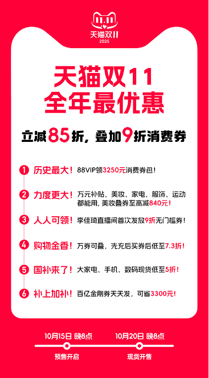 今晚8點(diǎn),天貓“雙11”預(yù)售開啟,10月20日晚8點(diǎn),可付尾款,正式現(xiàn)貨開賣。無門檻加“疊中疊”,一年最優(yōu)惠時(shí)刻即將來臨。