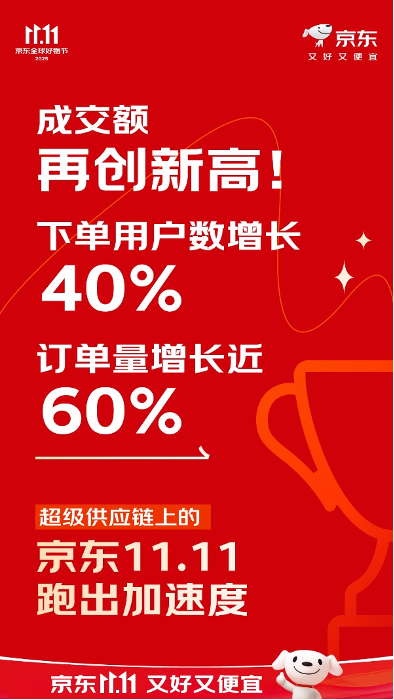 本報(bào)訊 (記者梁傲男)截至2025年11月11日23時(shí)59分,京東11.11成交額再創(chuàng)新高!下單用戶數(shù)同比增長(zhǎng)40%!訂單量同比增長(zhǎng)近60%!三方數(shù)據(jù)顯示,京東APP活躍用戶增長(zhǎng)幅度穩(wěn)居行業(yè)首位,在產(chǎn)品、價(jià)格、服務(wù)的綜合體驗(yàn)上京東收獲了最高的消費(fèi)者好評(píng)度。超級(jí)供應(yīng)鏈上的京東11.11跑出加速度。