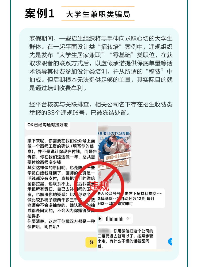 在公告中,安全團(tuán)隊(duì)重點(diǎn)提示了大學(xué)生寒假兼職的相關(guān)招轉(zhuǎn)培騙局——招生組織以招聘兼職設(shè)計(jì)之名,以“大學(xué)生居家兼職”“零基礎(chǔ)可做”“提供保底單量”等噱頭,誘導(dǎo)學(xué)生群體付費(fèi)參加培訓(xùn),但實(shí)際學(xué)生付費(fèi)培訓(xùn)后,并不能得到此前招生組織承諾的單量。