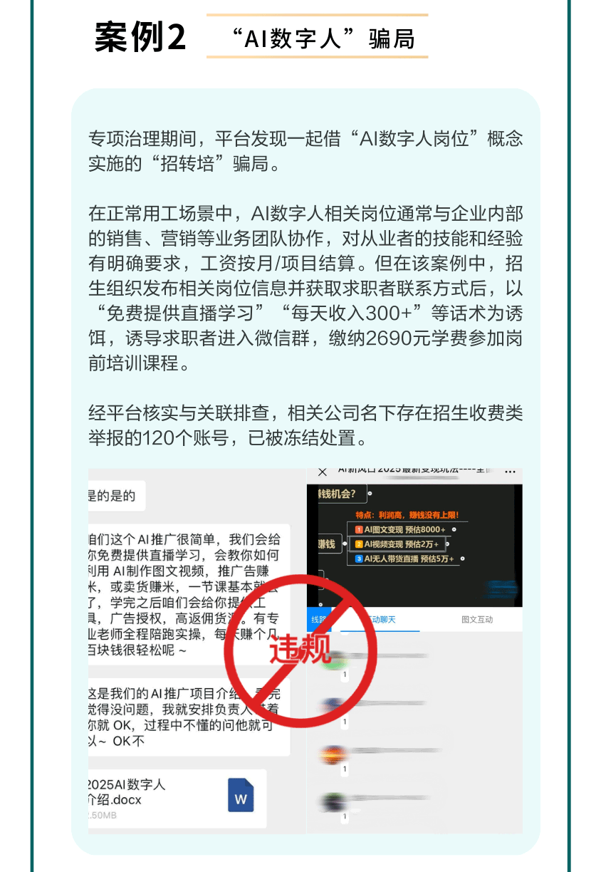 BOSS直聘在專項(xiàng)治理公告中披露了一起與“AI數(shù)字人崗位”相關(guān)的“招轉(zhuǎn)培”違規(guī)案例。某招生組織發(fā)布崗位信息并獲取求職者的聯(lián)系方式后,以“免費(fèi)提供直播學(xué)習(xí)”“每天收入300+”等話術(shù)為誘餌,引導(dǎo)求職者進(jìn)入微信群,要求付費(fèi)2690元參加所謂的崗前培訓(xùn)課程。